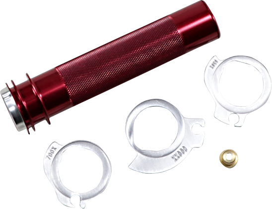 Caracteristicas: Give the rider better control, no matter what the ground condition Throttle cam system alters the ratio between hand-throttle rotation and opening of the carburetor, which improves the rider's control over the bike where it matters most, in the turns System includes a 6061 billet aluminum throttle tube with a knurled surface and three cams Delrin bushings in both ends of the tube eliminate all aluminum-to-aluminum contact to give the feeling of a ball-bearing tube without rust or freeze-up Each included cam is designed with track conditions in mind; one for perfect, one for intermediate and one for slippery or highly technical conditions One cam is stock diameter, the other two have different ramped shapes, which means the rider will turn their hand slightly farther to open the carburetor while in the zero to half-throttle range; the ramped shape ensures full throttle within a quarter turn Changing cams is easily achieved in less than a minute Throttle tube has removable end cap to allow installation of handguard