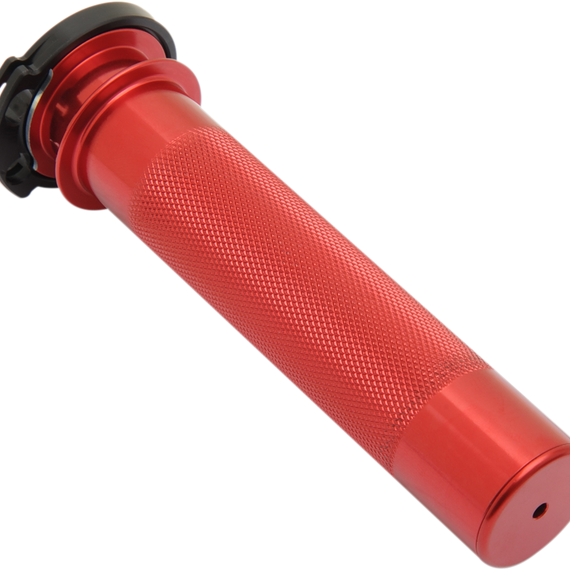 Caracteristicas: Throttle tube with larger-than-stock pulley causes throttle to open faster Less turn equals less elbow drop and a better riding position 6061 billet aluminum construction with knurled surface Delrin bushings in both ends of the tube eliminate all aluminum-to-aluminum contact to give the feeling of a ball-bearing tube without rust or freeze-up Installs into stock housing; no modifications required End cap is removable for handguard or bar end installation Made in the U.S.A.