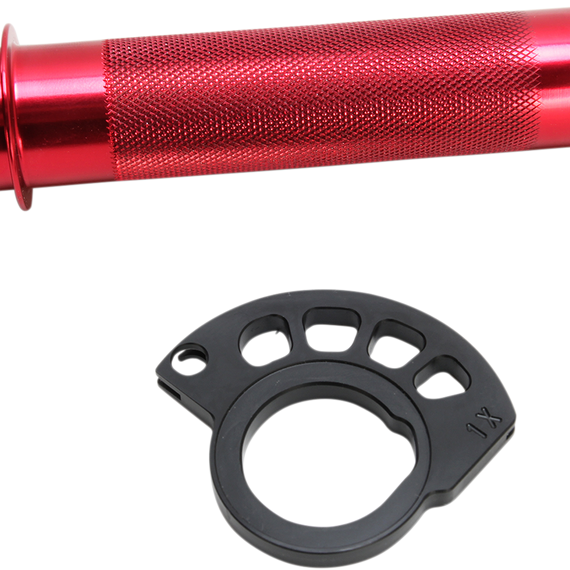 Caracteristicas: Throttle tube with larger-than-stock pulley causes throttle to open faster Less turn equals less elbow drop and a better riding position 6061 billet aluminum construction with knurled surface Delrin bushings in both ends of the tube eliminate all aluminum-to-aluminum contact to give the feeling of a ball-bearing tube without rust or freeze-up Installs into stock housing; no modifications required End cap is removable for handguard or bar end installation Made in the U.S.A.
