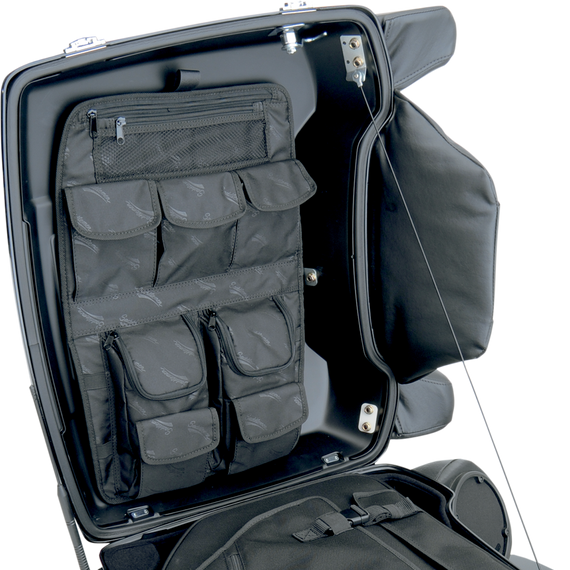 Caracteristicas: Trim, functional organizer fits snugly to the inner lid of a classic 97-13 Harley-Davidson Tour-Pak® Organize your trip packing and maximize your cargo space using the organizer's nine separate storage pockets A variety of elastic bands keep your flashlight, tire gauge and other gear in place, but easily accessible Easily installs to the lid by attaching to the rack fasteners or with the included self-adhesive hook-and-loop fastener tape strips Installation can be completed in minutes with no modification to your motorcycle Removes in seconds so you can use the convenient carrying handle to take your belongings into the hotel or your home at the ride's end Rugged construction will last a lifetime with its 600-denier and 150-denier polyester materials Measures: 20-1/4" x 14" x 1"