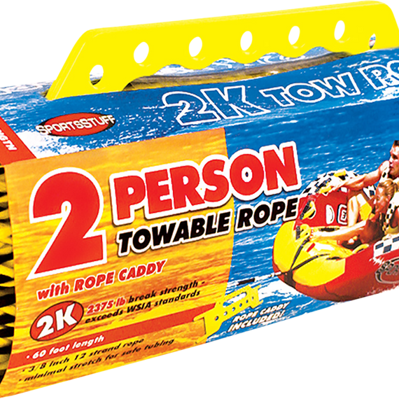 Caracteristicas: The 2K Tow Rope is 60 feet long, which is perfect for towing 1 and 2 person towables by Airhead or Sportstuff. The bright yellow color is highly visible, so you never have to worry about locating the rope in the water. It features a molded plastic caddy for easy organization and storage This 2 person towable tube rope is designed for the safest, fastest tubing experience you can get. At 2,375 pound break strength, this rope exceeds requirements by the WISA for two person towable tubes Rugged and durable construction Made of Polypropylene Low stretch design