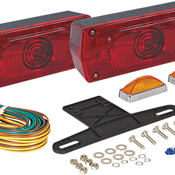 • Contains two universal mount taillights with red side markers and reflectors, two seated amber side markers, license bracket, 25' wiring harness and all necessary hardware