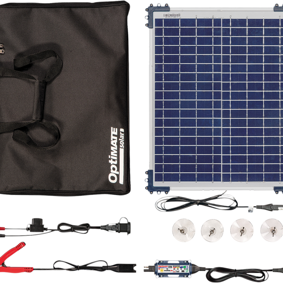 Caracteristicas: The smart sun-powered charger & maintainer for all 12v batteries – Charger by day, monitor by night Ideal for all lead-acid & lithium batteries found in powersports equipment The smart charge controller automatically adjusts charge according to battery type and condition The controller’s fully automatic multi-step program brings the battery safely to full charge includes polycrystalline solar panel assembly with aluminum frame, , suction for mounting, OptiMate Solar DUO controller, O-04 battery clips, O-01 battery lead, and carry bag Saves your ‘dead’ battery from as low as 4v IP54 weather rated