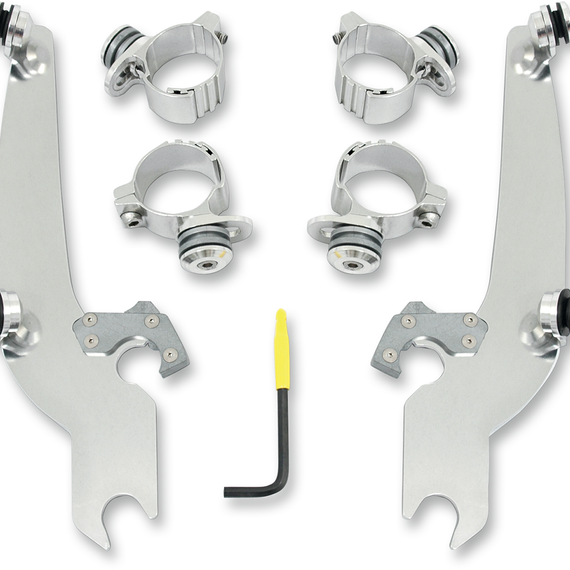 Caracteristicas: The revolutionary No-Tool Trigger-Lock mounting kits feature a detach system that allows you to quickly and easily remove or swap out your Sportshield without the use of any tools A pair of latches lock the windshield down until the spring loaded "trigger locks" are intentionally disengaged, allowing the rider to remove the windshield Kits are a combination of CNC-machined aluminum plates and anchors, stainless steel hardware, gray polymer bushings and glass-filled nylon latches or "Night Shades" black version which, is a gradient black windshield with black E-coated stainless steel straps, fittings and hardware for a black-on-black sinister look Kits are custom-fit to each style of bike for no-hassle installation