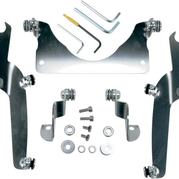 • Kits are a combination of CNC-machined aluminum plates and anchors, stainless steel hardware, gray polymer bushings and glass-filled nylon latches or "Night Shades" black version which, is a gradient black windshield with black E-coated stainless steel straps, fittings and hardware for a black-on-black sinister look