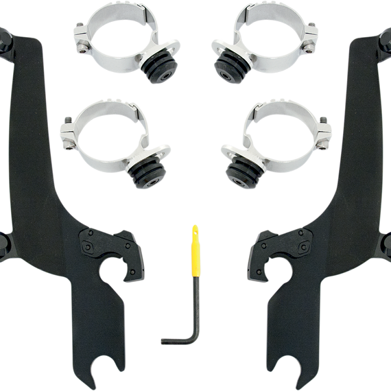 Caracteristicas: The revolutionary No-Tool Trigger-Lock mounting kits feature a detach system that allows you to quickly and easily remove or swap out your Sportshield without the use of any tools A pair of latches lock the windshield down until the spring loaded "trigger locks" are intentionally disengaged, allowing the rider to remove the windshield Kits are a combination of CNC-machined aluminum plates and anchors, stainless steel hardware, gray polymer bushings and glass-filled nylon latches or "Night Shades" black version which, is a gradient black windshield with black E-coated stainless steel straps, fittings and hardware for a black-on-black sinister look Kits are custom-fit to each style of bike for no-hassle installation