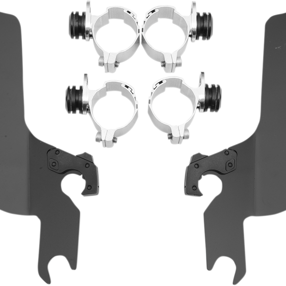 Caracteristicas: The revolutionary No-Tool Trigger-Lock mounting kits feature a detach system that allows you to quickly and easily remove or swap out your Sportshield without the use of any tools A pair of latches lock the windshield down until the spring loaded "trigger locks" are intentionally disengaged, allowing the rider to remove the windshield Kits are a combination of CNC-machined aluminum plates and anchors, stainless steel hardware, gray polymer bushings and glass-filled nylon latches or "Night Shades" black version which, is a gradient black windshield with black E-coated stainless steel straps, fittings and hardware for a black-on-black sinister look Kits are custom-fit to each style of bike for no-hassle installation