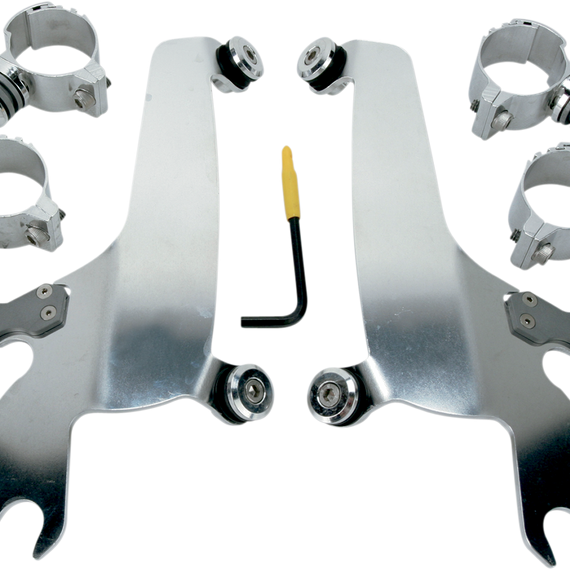 • Kits are a combination of CNC-machined aluminum plates and anchors, stainless steel hardware, gray polymer bushings and glass-filled nylon latches or "Night Shades" black version which, is a gradient black windshield with black E-coated stainless steel straps, fittings and hardware for a black-on-black sinister look