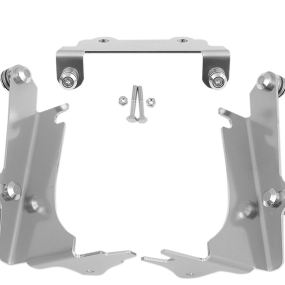 Caracteristicas: The revolutionary No-Tool Trigger-Lock mounting kits feature a detach system that allows you to quickly and easily remove or swap out your Sportshield without the use of any tools A pair of latches lock the windshield down until the spring loaded "trigger locks" are intentionally disengaged, allowing the rider to remove the windshield Kits are a combination of CNC-machined aluminum plates and anchors, stainless steel hardware, gray polymer bushings and glass-filled nylon latches or "Night Shades" black version which, is a gradient black windshield with black E-coated stainless steel straps, fittings and hardware for a black-on-black sinister look Kits are custom-fit to each style of bike for no-hassle installation