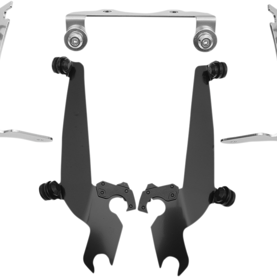 Caracteristicas: The revolutionary No-Tool Trigger-Lock mounting kits feature a detach system that allows you to quickly and easily remove or swap out your Sportshield without the use of any tools A pair of latches lock the windshield down until the spring loaded "trigger locks" are intentionally disengaged, allowing the rider to remove the windshield Kits are a combination of CNC-machined aluminum plates and anchors, stainless steel hardware, gray polymer bushings and glass-filled nylon latches or "Night Shades" black version which, is a gradient black windshield with black E-coated stainless steel straps, fittings and hardware for a black-on-black sinister look Kits are custom-fit to each style of bike for no-hassle installation