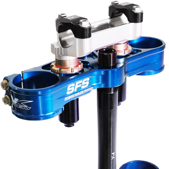 Caracteristicas: CNC machined from aerospace quality Tridium alloy Handlebar clamp included Easy to install; pre-pressed Pivot Works lower bearing included The industry's first air-adjustable, oil-damped suspended handlebar clamp, offering 10mm of travel Improve the riding comfort and decrease arm pump Developed in collaboration with top US MX/SX and MXGP teams No service required Torque settings etched on clamps Patented in Europe and USA High-pressure air pump required to adjust the clamps
