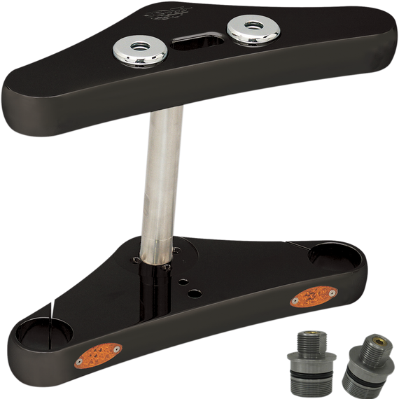 Caracteristicas: CNC-machined from aircraft-quality billet aluminum Includes fork tube plugs that allow for a clean, finished look on the top of the triple tree Triple trees are pre-drilled to mount the Pro-One Hide Away internal fork stop kits Includes handlebar dampers with chrome billet caps, a fork stem, and all the necessary mounting hardware Accepts 41 mm fork tubes Raked triple trees change handling characteristics of motorcycle. Steering geometry must be calculated to determine which degree of rake is most suited for application. Trees with more than 3° of rake should not be used in stock frame applications.
