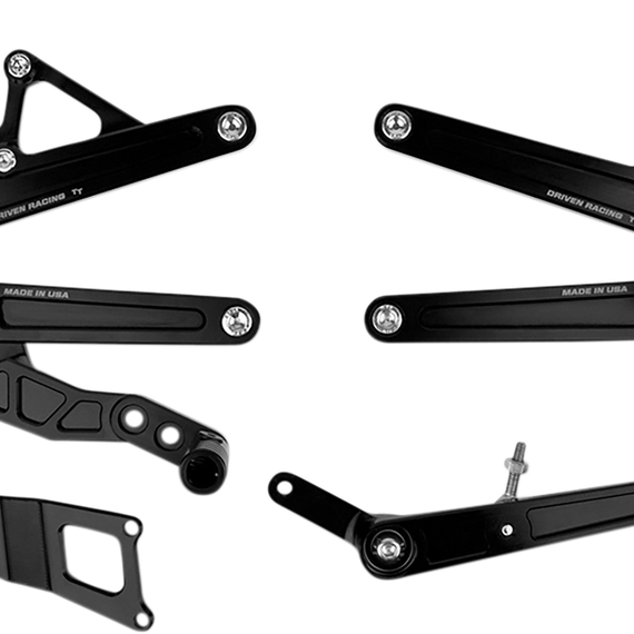 Caracteristicas: Race-inspired design All rearsets feature high-grade hardware, folding shift/brake pegs and standard or reverse shift pattern options Footpeg plate has a small window that shows peg adjustment value and conceals all mounting holes not in use Anodized black finish