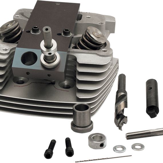 Caracteristicas: For big-inch or high compression Twin Cams Works on front and back head, with or without valves installed Simply drill, spot face, tap and install compression release valves Installation kit includes fixture, drill bit, spot face bit and thread-tapping tool