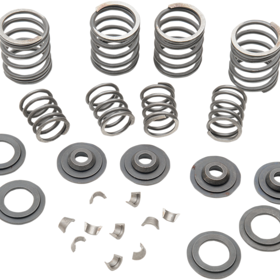 • Kit includes four inner and outer springs, four steel lower collars, four steel upper collars and eight valve stem keys