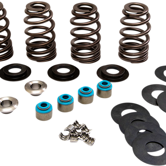 Caracteristicas: Made from premium stress-relieved conical ovate wire Feature extremely high-level of fatigue life Use a much smaller and lighter weight retainer to reduce valve weight and create quicker rev and smoother motion Designed to handle the demands of performance engines with 585" and smaller lift camshafts Kits include: Econo BeeHive® valve springs, lightweight 7° steel retainers, machined heat-treated chromoly spring seats, seat shims, valve locks and a set of premium Viton® valve seals equipped with spring-loaded valve stem wiper system Seat lbs./installed height; 183 lbs. at 1.770" (0.510" lift), 175 lbs. at 1.795" (0.535" lift), 172 lbs. at 1.813" (0.553" lift), 165 lbs. at 1.835" (0.574" lift), 160 lbs. at 1.845" (0.585" lift), 380 lbs. at 1.260" OPEN HEIGHT coil bind at 1.190" Dyno proven and track tested Feuling® BeeHive® valve springs must be installed at the correct OPEN HEIGHT, matching max lift to the open height spec of the valve springs Made in the U.S.A. Econo BeeHive® kits are direct replacement with no machining or rocker box clearance required for cams up to .574" lift for 84-04 Big Twin and 86-03 XL and up to .585" lift for 05-17 Twin Cam.