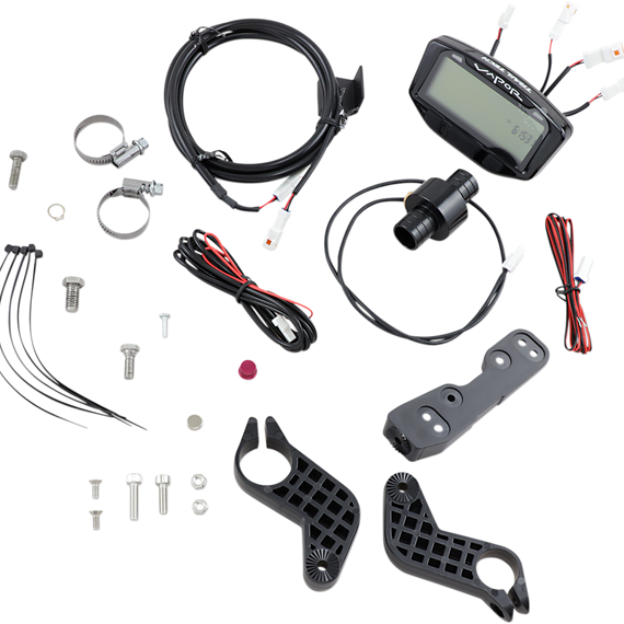 Caracteristicas: Speed, temperature, distance, tachometer and clock Speedometer functions: current, average, maximum; selectable mph/kph Temperature functions: ambient temp, engine temp with LED alerts, dual programmable temp lights, exact model fit temp sensors; selectable F/C scale Distance functions: adjustable distance, permanent odometer; selectable mile/kilometer Tachometer functions: real-time rpm bar graph, numeric rpm readout, dual programmable shift lights; up to 20000 rpm Clock functions: hour meter, stop watch, ride time; selectable 12/24 hour display Include universal power connector for all machines and accepts AC and DC power Waterproof design with high-intensity LCD white backlight display