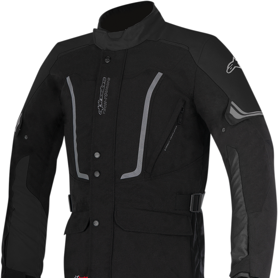 Caracteristicas: Multi-material main shell construction with Polyurethane (PU) coating for durability, abrasion and tear resistance and protection from the elements Waterproof and breathable DRYSTAR® liner with taped seams to ensure excellent weather performance Extensive ventilation zipper opening strategically placed on chest for cooling performance Removable and replaceable shoulder and elbow protection for superb impact protection Chest and back pad compartments with Polyethylene (PE) padding (Alpinestars’ Nucleon chest and back protectors available as accessory upgrade, sold separately) Removable long sleeve thermal liner means jacket can be worn in colder climates High collar construction help protect neck from the elements; collar has soft comfort textile insert to improved comfort in the neck area Interior waterproof compartments for safe storage of documents D-ring waist adjustment belt allows for tight closing of garment Multiple fit and volume adjusters ensure close-fit of garment and helps keep protections in position Anatomical, pre-curved sleeves incorporate accordion stretch inserts on elbows for excellent movement and flexibility in the riding position Reflective detailing on front back and sleeves for increased rider visibility Premium YKK zippers with twin sliders on front zipper, plus waist connection zipper for secure attachment to Alpinestars riding pants