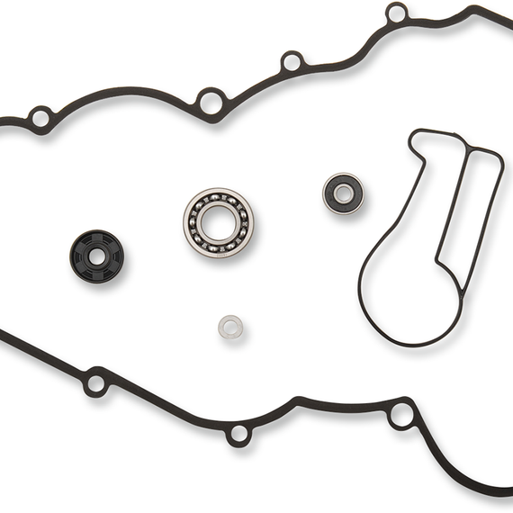 • Typical kit includes the following: bearings where applicable; rubber seals; mechanical water pump seal where applicable; side cover gasket; water pump gasket; snap rings located on water pump shaft and copper drain washers