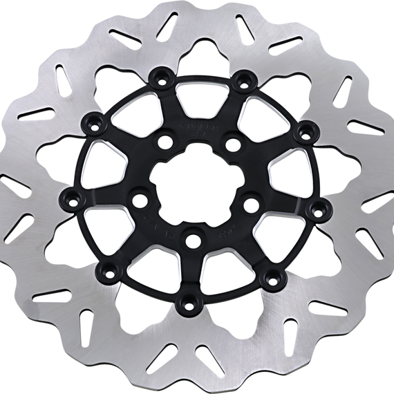 Caracteristicas: Made from 420 high-carbon stainless Tier-1 steel Laser cut, never stamped Each rotor is individually heat-treated and double-disc parallel ground to ensure perfect flatness Much lighter than a stock rotor WAVE® design allows for lower operating temperatures at extreme conditions Full floating design with black rotor carrier and silver contrast cut