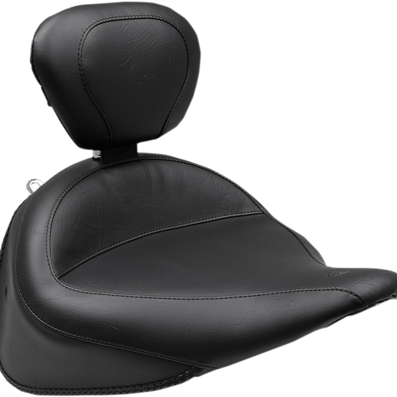 Caracteristicas: Solo seat is trimmed with a functional skirt that comes down over the frame and fender for a clean, uninterrupted look Steel base with support wings holds up the full width of the foam bucket Matching rear seat features a recess in the front of pad to accommodate the backrest (sold separately) Backrest has four height adjustments from 13.5" to 15.5" above seat bucket, and measures 7" high by 12" wide Backrest is easily removed and installed without tools; folds forward for easy mounting of bike Made in the U.S.A.