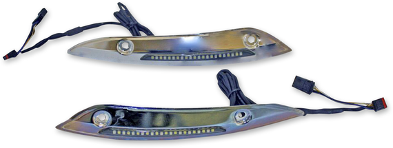 Caracteristicas: Aluminum trim with flush mounted amber/white LEDs behind a smoked lens White running light LEDs are automatically deactivated when the turn signals or hazard warning lights are activated, allowing for greater visibility of the turn signals Direct bolt-on installation with included mounting hardware and wiring Plug-and-play installation