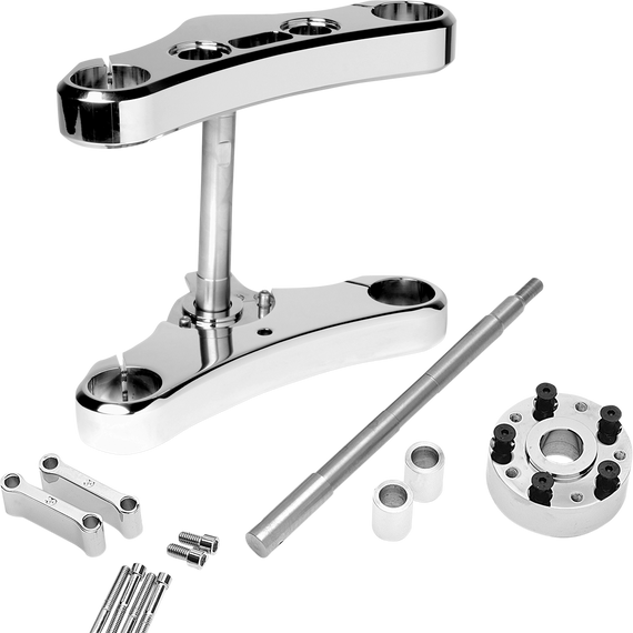 Caracteristicas: Manufactured from billet aluminum Include triple trees, rotor spacer, fender spacers, axle spacers, axle and instructions Made in the U.S.A. Raked triple trees change the handling characteristics of the motorcycle. Steering geometry must be calculated to determine which degree of rake is most suited for your application. Trees with more than 3° of rake should not be used in stock frame applications.